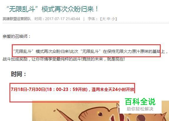 无限火力只有活动时间,即无线乱斗,无限火力只有在活动时间开启,上次开启时间是7月18到7月30,没来及玩无限火力的小伙伴可能会有点遗憾了,不过下次还会开启的。