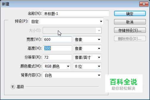 新建一个文档,尺寸大小:600×300、分辨率为:72、背景色:白色。