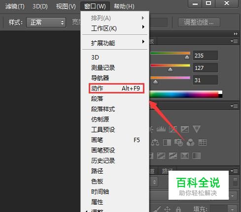 在该界面的菜单栏里找到窗口菜单,点击窗口菜单在其子级菜单里找到动作选项,如图所示: