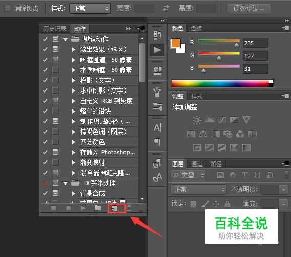 点击动作选项弹出动作面板,在动作面板里找到新建动作选项,如图所示: