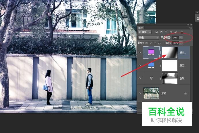 使用同样方法创建一个新的颜色调整层,降低不透明度。 在蒙版上,快速擦除右边的区域以完成两边分色效果。