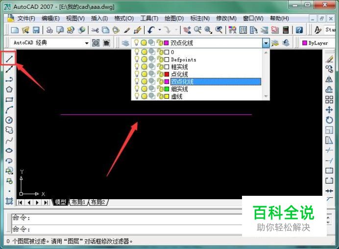 进入绘图界面后,在“图层特性管理器”中选择双点划线图层,然后利用绘图工具栏中的“直线”工具绘制一条直线,可以发现双点划线中间的点并没有显示出来,如图所示:
