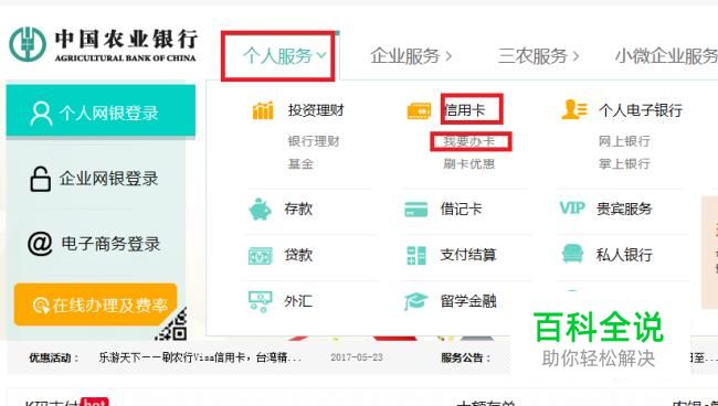 登录到农业银行的官网,选择“个人服务”,选择“信用卡”选择“我要办卡”。