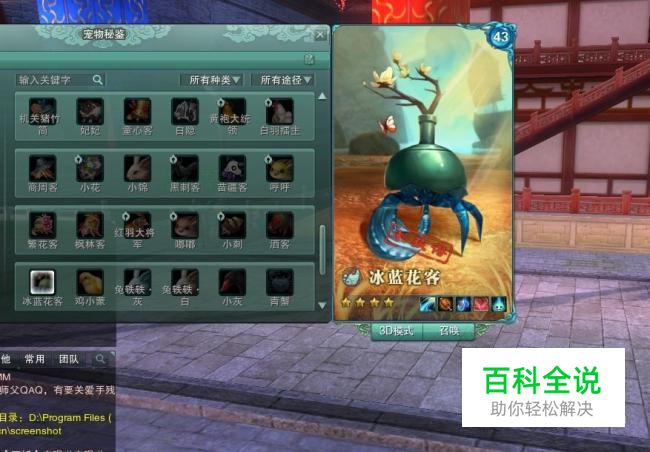 完成以上就成功获取了冰蓝花客,但是需要驯养长大才能召唤出来,在主城的马商处买鱼虾饲料喂养到五级。