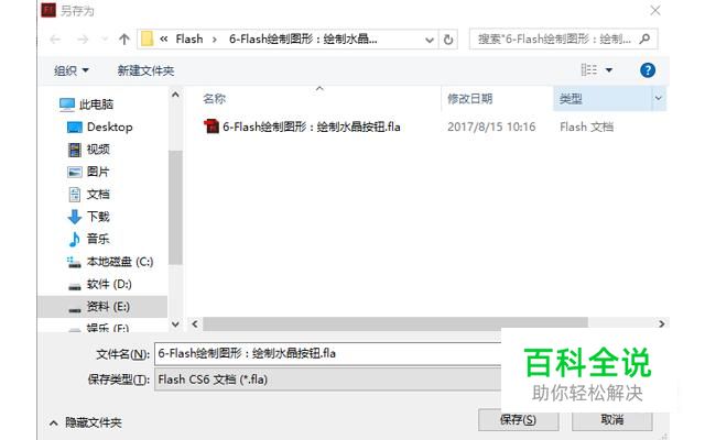新建一个Flash文档,然后按Ctrl+S组合键打开【另存为】对话框,设置【文件名称】为“水晶按钮”,如图所示。