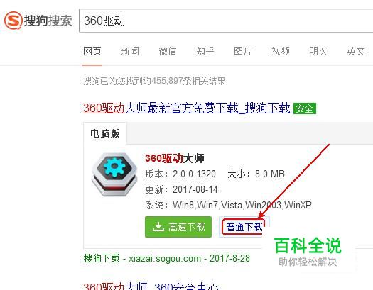 “搜狗下载”提供360驱动的下载服务,点击“普通下载”(如果安装了搜狗下载器的则点击“高速下载”)