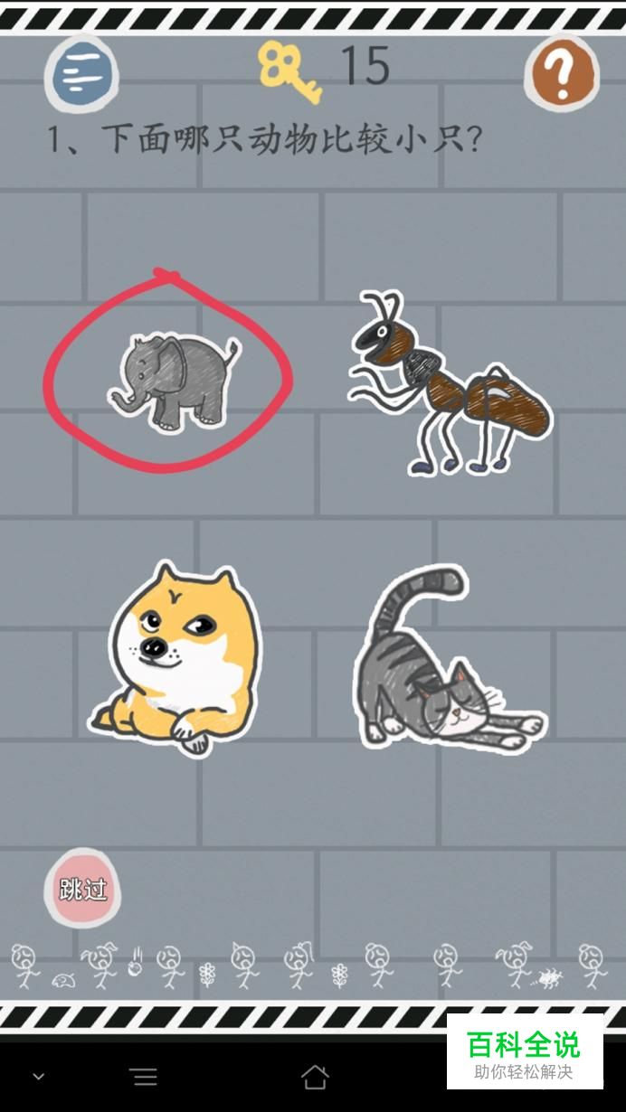 第一关:选择真正在画面中【小只】的动物,答案是大象。