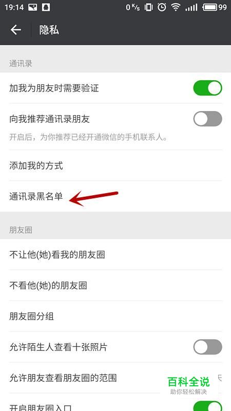在隐私中,选择“通讯录黑名单”。
