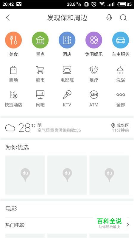 百度地图是百度提供的一项网络地图搜索服务,覆盖了国内近400个城市、数千个区县。在百度地图里,用户可以查询街道、商场、楼盘的地理位置,下面教你用百度地图搜索附近银行。