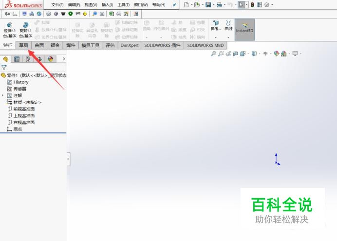 打开Solidworks软件之后,进入零件图,然后选择草图。