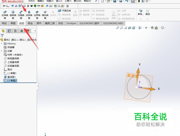 选择放样曲面将圆杆和刚刚裁剪的曲面连接到一起。