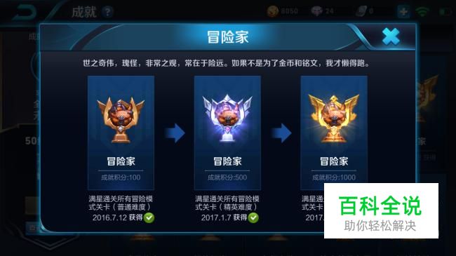 冒险家:成就的达成条件还是比较好做到的,只需要满星通关某一难度副本就可以获得了,副本除了大师难度的最后几关比较难以外,别的都能轻松达成,这是一个门槛很低的成就,还没获得的小伙伴赶快去获得吧。