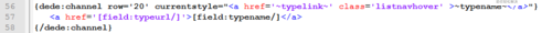 在dede的templets目录下的对应模板写: {dede:channel row='20' currentstyle="<a href='~typelink~' class='listnavhover' >~typename~</a>"} <a href='[field:typeurl/]'>[field:typename/]</a> {/dede:channel} 如图: