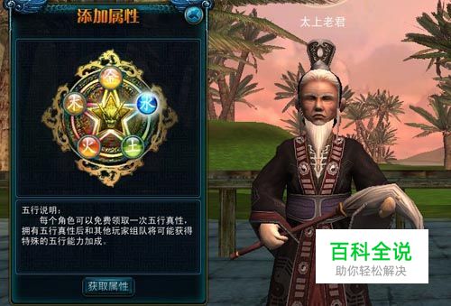 18级时,你可以找到蓬莱港的太上老君,选择“获取属性”,选择一种五行属性。在组队战斗中,如果你的五行与队友的相生或相克,都可以得到属性的加成效果,让你瞬间如虎添翼。