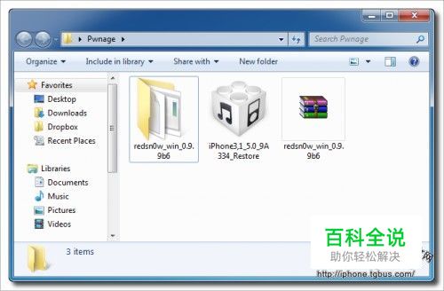 在桌面上创建一个名为Pwnage的文件夹 下载红雪RedSn0w 0.9.9b6(请点击下载地址) 把下载的RedSn0w 0.9.9b6放在 Pwnage的文件夹里面。同样地,下载iPhone的iOS 5.0的固件(请点击下载地址)然后也放在Pwnage文件夹里面。(注意:如果你的iPhone已经升级到iOS 5系统的话就不用再次下载iOS 5的固件了。) 双击解压RedSn0w的zip文件