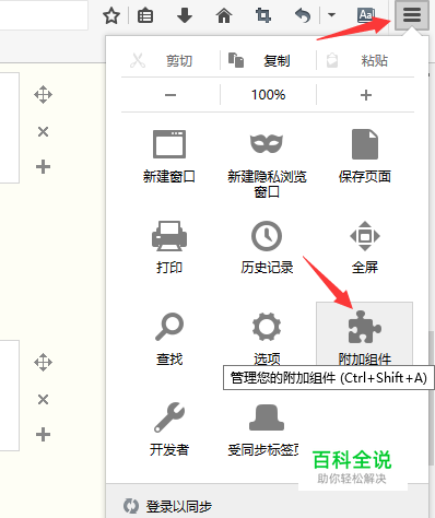 打开Firefox,右上角。在这个菜单中我们可以看到附加组件的选项,选中