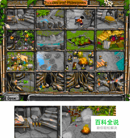5.蝴蝶:这个要水渠好了,在地图的右下方有一个水草,它会变得健康。上面有蝴蝶在飞,让一个去割草,然后那个人会头顶冒烟,然后慢慢的移动,让蝴蝶跟着。 要清理了水渠之后,实验室左下角的那棵枯死的绿色植物受到浇灌会复活,之后就有蝴蝶在那。再要在磨好刀具之后,派人去砍那棵植物,就会染上这种植物的气味,头顶冒绿烟,以吸引蝴蝶。再慢慢拖这个人去最上面的大榕树旁(要慢一点,好让蝴蝶能跟上),最后让他把东西抹擦在大树干上就好了 放在这他会自动去拿刀割草,当头有有烟时把人物拖到树下,他会自动完成任务,注意蝴蝶要跟着