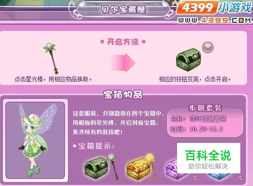 告别了海蓝水手套装,贝尔宝藏屋更新新的套装兑换——绿叶旖旎套装。这套套装是绿色和白色调,非常清新的感觉噢~具体的情况请和4399小花仙一起到贝尔宝藏屋看看吧~