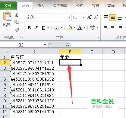首先,打开Excel2010,在表格中录入好包含身份证号码的数据表,接下来点击要放置年龄的单元格。