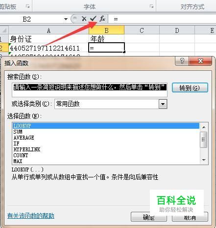 再点击编辑栏的插入函数按钮,弹出插入函数对话框,在类别处选择日期与时间类,在列表框中选择YEAR函数,按确定。