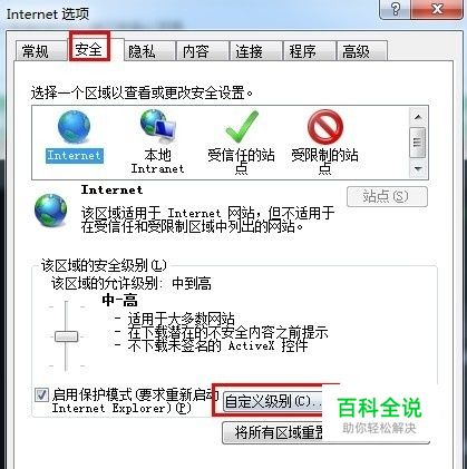 点击“安全”进入“Internet”点击“自定义级别”。