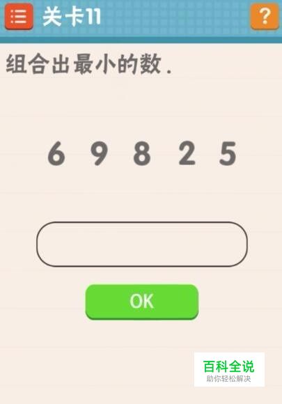 11关卡,组合出最小的数。在标题的后面有个点点符号,将点点拉到框框里面的第一个数字后面,数字按照从小到大的顺序排列。即可过关