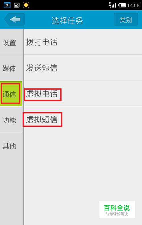 下载安装定时达人软件(安卓手机端),进入首页,点击下部的“添加新任务”,左边选择“通信”项,这时就可以看到右边的“虚拟电话”和“虚拟短信”选项: