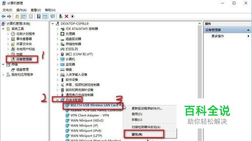 打开设备管理器并设备无线网卡属性: 在“此电脑”上点击鼠标右键,在弹出菜单中选择“管理” 然后在弹出的菜单中依次选择:设备管理器——网络适配器,在自己电脑无线网卡设备名称(不同的无线网卡名称不同)上右键单击鼠标选择属性 最后在弹出的属性框中选择:电源管理,然后把“允许计算机关闭此设备以节约电源”的勾去掉,点击确定
