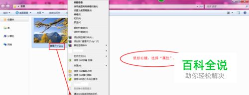 首先选中自己需要查看尺寸的图片,鼠标右键,弹出菜单,选中“ 属性”项。 如图: