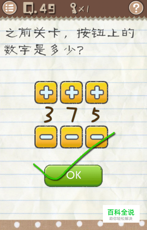 第四十九关,这题又是跟前面的题关联着,回顾第四十四关,上面的数字是“375”,输入这几个数字,就可过关;