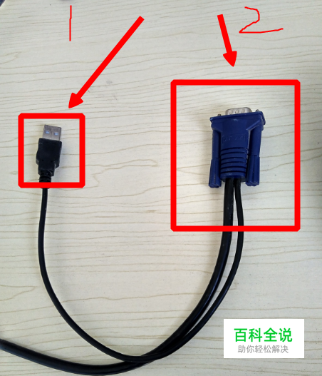 首先你需要把转接线插在电脑的usb和vga的插口上,两根线都要插上。1为usb口,2为vga口