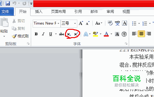 首先打开Word,在开始菜单栏当中有个X2的标志,就是图中画红圈的部分,分别代表下标和上标。