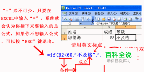 这个功能的实现,会用到 if( ) 函数。它的基本语法是: if(条件,A,B) 【解释】如果条件成立(为真),则执行A,如果条件不成立,则执行B。 【注意】 ①公式请在英文状态下输入,比如逗号,不能是中文状态的逗号,括号不能是中文状态的括号。 ②如果公式中遇到输入中英文字符,请在中英文字符外加“英文双引号” ③在EXCEL中输入公式前,一定先输入“=”(等于号) 【举个例子】看图 公式if(B2<60,"不及格","及格")的意思是,先判断“55”这个分数是不是低于60分,如果低于60分,就显示(返回值)“不及格”,如果不低于60分,就显示“及格”。