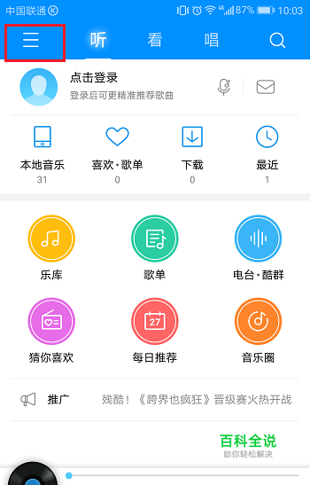 第二步进去音乐主界面之后,点击左上方的菜单列表图标,如下图所示:
