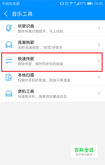 第四步进去音乐工具界面之后,点击极速传歌,如下图所示: