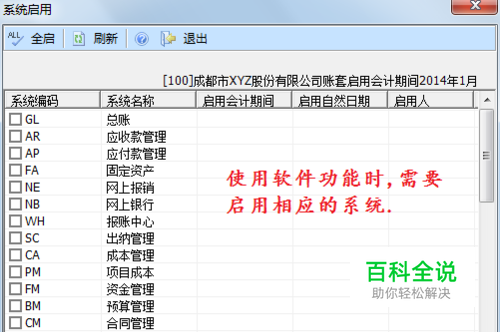 (注意:本系列经验后续内容需要启用“GL 总账”系统,接下来的内容属于介绍关闭系统的方法。)假设需要关闭系统,同样打开“系统启用”对话框,取消已勾选的系统。