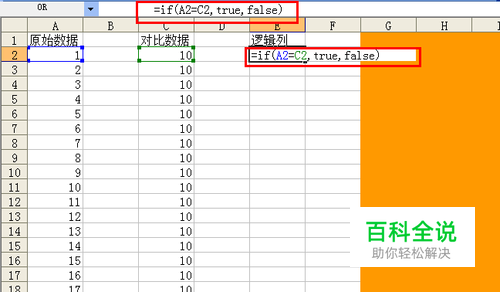 我先来说一下利用公式的做法,我们找到另外一列作为逻辑列,然后通过这列对前两列的数据进行一个筛选,在单元格里输入:=IF(A2=C2,true,false),公式的大小写无所谓,true和false也无所谓,只需要找代替的就行,0,1也可以,反正是返回不同的值,公式的意思是,如果A2=C2,那么就返回一个true,如果不等于,就返回一个false。