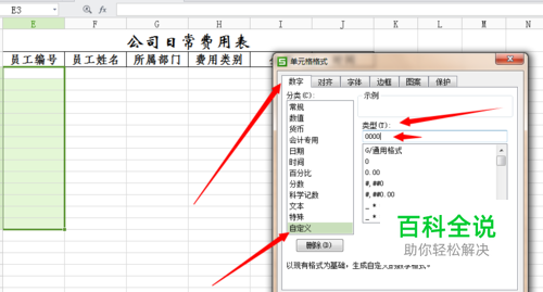 自定义数据格式。 弹出设置单元格格式,在数字选项下选择分类列表框中的自定义,在类型文本框中输入数字格式0000,如下图所示。