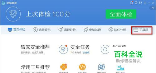 首先打开电脑管家软件,选择【工具箱】。