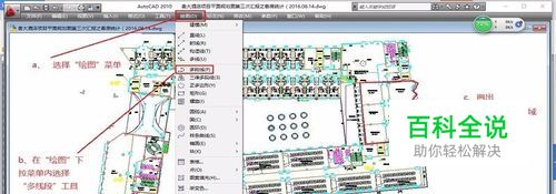 2、在需要局部填充颜色的建筑平面图上,用“绘图”工具在需要填充颜色的局部平面图画一个封闭的框:a、选择主菜单里“绘图”功能,b、在“绘图”下拉菜单内选择“多线段”工具。c、用“多线段”功能画出需要填充的区域。