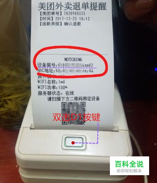 打印机设备插上电源,D1按键指示灯显示绿色,双击D1按键打印机会自动打印一张“小身份证”,有我们需要用到的设备编码和绑定设备扫描的二维码。