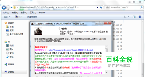 我以刺客信条2为例,是在win7上运行的。 在弹出警告窗口的时候,可以试试把游戏重新启动几次。如果不能解决就往下看 首先我们找到下载的破解补丁。