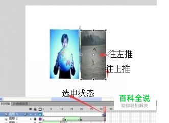 添加图层三,点击第二帧。右键【插入空白关键帧】。在把库面板里的【元件三】拖进舞台。【水平中齐】。【垂直中齐】。锁住【图层二】。点击【元件三】图片。点击【修改】【分离】两次。把【图层三】拖到【图层一】的下面。在【图层二】的第【三十帧】右键点击【插入帧】。点击【图层三】的第【二十帧】右键点击【插入关键帧】。在第【三十帧】。右键点击【插入关键帧】。把【元件三】往左推。并往上推。在【二十五帧】右键点击【创建补间动】。图层三上锁’
