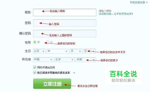 大家可以为自己起个酷酷的昵称,输入密码,选择自己的性别、出生日期、家乡等信息,填好后,就可以点击立即注册,系统会自动分配你一个QQ号,如果对自己的QQ号不满意,可以再按照上面的步骤重新申请。