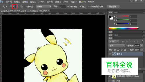 选择左边的工具栏里的魔术棒工具记住不要用魔术橡皮擦,魔术橡皮擦只有在PS格式内才会显示透明