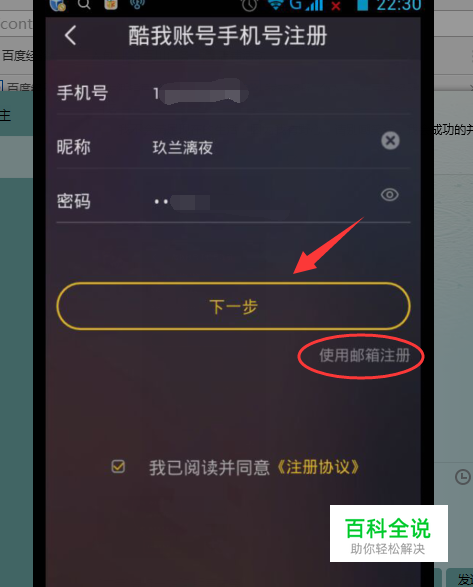 第四,酷我账号都是由手机号或邮箱注册,在“手机号注册”页面中,填写好自己要注册的手机号,起一个自己喜欢的“妮称”,再要起一个想要“密码”,认真填写好后,点击进入“下一步”。如下图示: