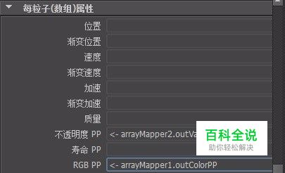 Maya旧粒子系统的属性大多都是由表达式控制的,因此为首先为粒子添加两个动态属性RGBPP和transparentPP,然后通过设置表达式rgbpp->arrayMapper1.outColorPP将粒子的颜色调成淡蓝色的渐变,调节ramp,直到颜色感觉适合为止。