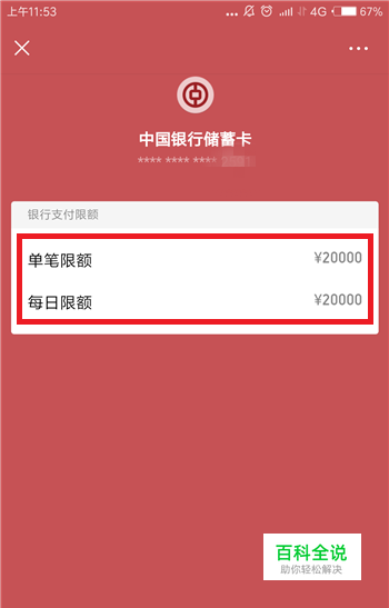 接下来我们就能看到这个银行卡的单笔限额和每日限额了,小编绑定的是中行,可以看到都是2万。