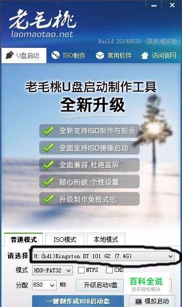 打开启动器,选择当前插入的U盘,在黑色框住部分选择