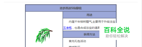 仙柳枝的主要功能是合成以及升级法宝“玉净瓶”,“玉净瓶”的基础属性是目前三件法宝中最高的,主动技能也比“桃木剑”的主动技能更加实用。